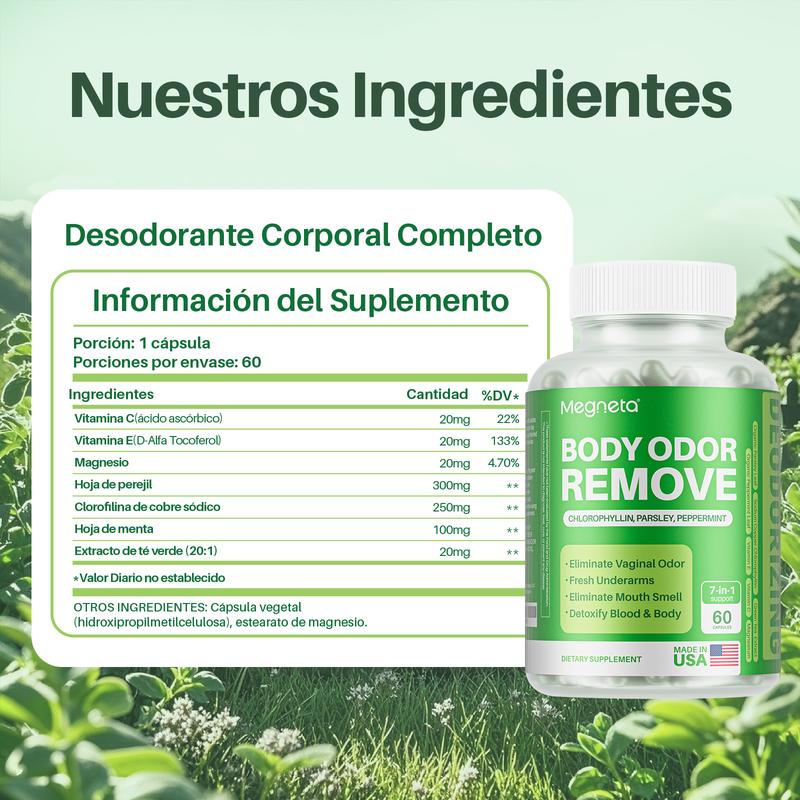 - 100% Natural & Made in USA: MEGNETA Body Deodorizing Supplement are made from 100% natural herbs, gluten-free, and vegan.—a safe, natural alternative to chemical deodorants.